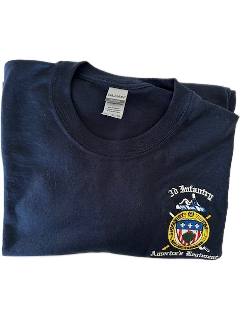 50% polyester & 50% cotton crew neck T-Shirt, navy, short sleeves, embroidered in white letters – “3rd Infantry” and “America’s Regiment” around The Old Guard Crest.